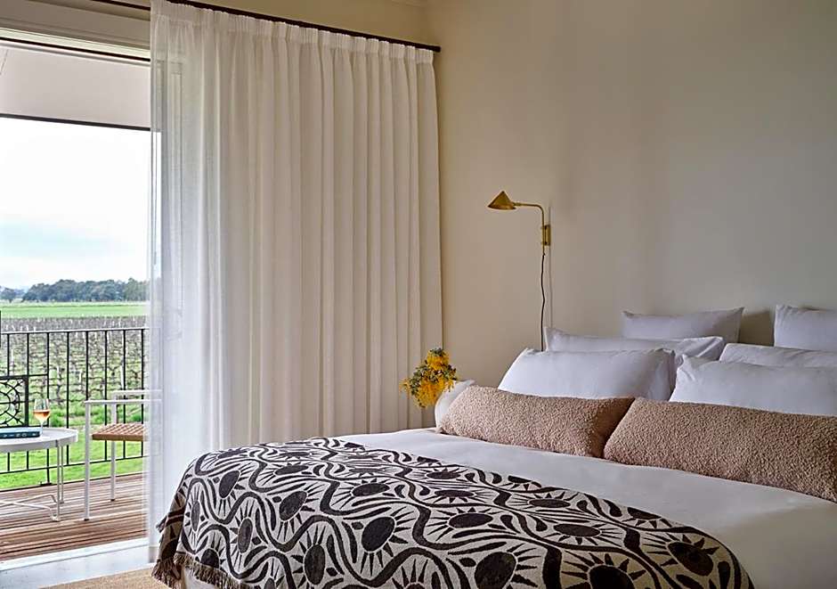 As the morning sun caresses the grapevines to the east, the Superior Balcony Sunrise rooms offer views as far as Mount Buffalo. With 42-square-yards of space, each room is appointed with a king-size bed, luxurious bouclé daybed, television, mini-bar and ensuite. The shared balcony overlooks the eastern fish pond, bordered by fragrant roses in late spring.